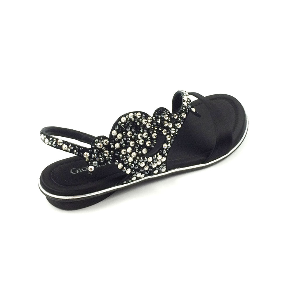 Super chic flat sandal featuring an elegant satin lining and sparkling elements for shining evenings.